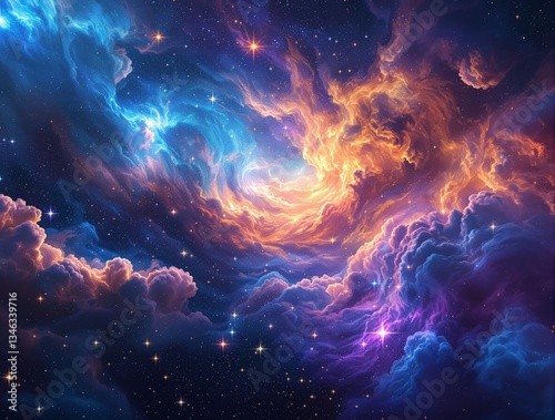 Vibrant cosmic nebula with swirling blue and orange clouds in deep space, filled with glowing stars. A creative fantasy background of science fiction. Ai generative