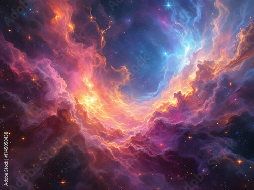 Vibrant cosmic nebula with swirling colors and glowing stars in deep space.
