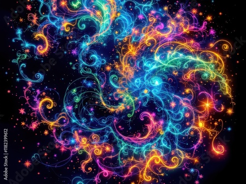 abstract, background, bright, colourful, cosmic, cosmos, creative, decorative, design, digital, energy, fantasy, fireworks, glow, glowing, graphic, illustration, light, magical, neon, night, pattern, hallucinogen, radiant, shining, space, sparkle, star, star, swirl, swirl, texture, universe, vibrant, swirled, celestial