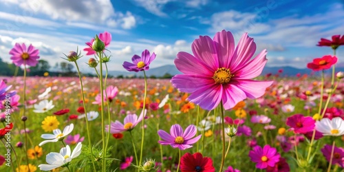 Vibrant cosmos flower field with tall stalks and varied colors in a serene landscape, colorful blooms, meadow flowers