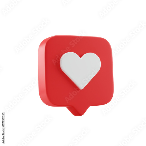 Vibrant crimson red notification icon with white heart, macro 3/4 view, isolated in white studio with soft, shadowless lighting, digital notification concept