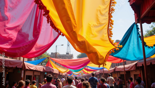 festival, crowd, marketplace, colourful, draped, fabric, urban, celebration, people, joy, vibrant, cultural, lively, decoration, tent, sunlight, atmosphere, local, community, tied-up, event, energy, festive, gathering, diversity, cheerful, happiness, excitement, colours, summer, day, warmth, entertainment, street scene, art, design, tradition, shopping, life events, market, decoration, social, interaction, fun, togetherness