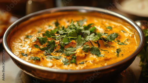 vibrant curry dish garnished with fresh coriander, showcasing rich flavors and textures. Perfect for delightful meal experience