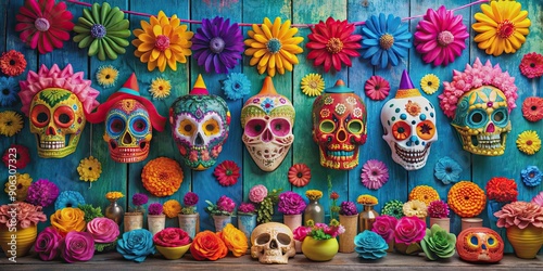 Vibrant Day of the Dead celebration with colorful paper mache decorations, Day of the Dead, celebration, Mexican