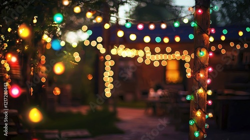 backyard, evening, party, light, colourful, string, lantern, tree, wooden, house, rustic, warm, decor, festive, celebration, glowing, cosy, night, nature, green, grass, relaxing, chair, table, event, summer, garden, hanging, serene, inviting, fairy, ambient, gloaming, sparkling, twinkling, beautiful, relaxed, wood, tree branch, leaf, soft, atmosphere, light