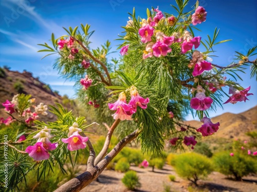 Vibrant desert willow tree with delicate, trumpet-shaped flowers and slender branches sways gently in the warm Texas sunlight, amidst a serene, arid landscape.