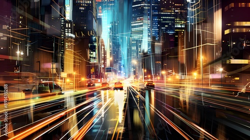 city, street, night, light, trail, skyscraper, urban, ai, era, abstract, digital, art, motion, blur, vibrant, colours, dynamic, lighting, effect, technology, modern, city landscape, neon, glowing, artificial, intelligence, future, trend, creativity, innovation, movement, electricity, energy, tower, highrise, architecture, graphic, illustration, design, artistic