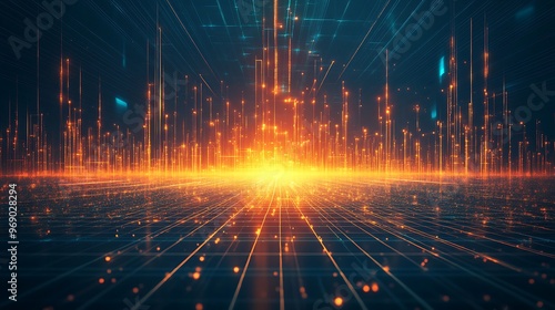 Vibrant digital landscape featuring glowing orange particles in a futuristic grid setting, symbolizing technology and innovation.