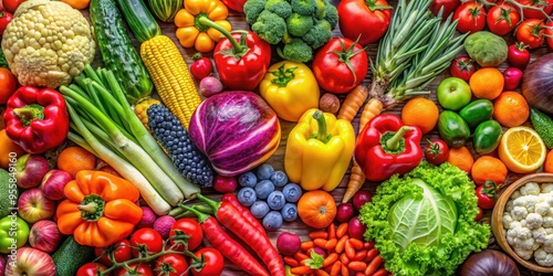 Vibrant display of fresh, colorful fruits and vegetables , healthy, food, concept, real, display, colorful, fruits, vegetables