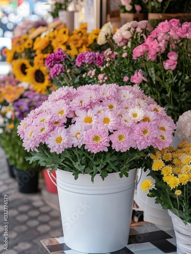 Vibrant Display of Fresh Pink and Yellow Chrysanthemums in a White Bucket Surrounded by Colorful Flower Arrangements in a Flower Shop