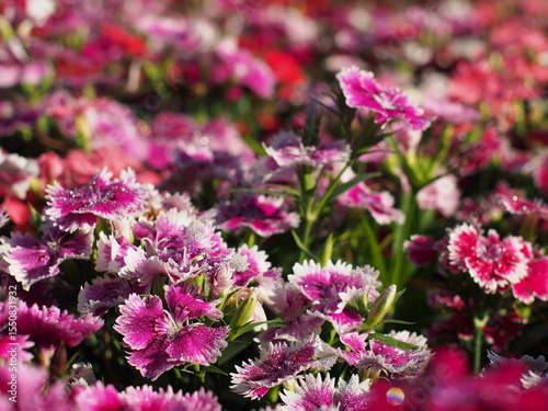 Vibrant display of Red, pink, white, and purple Dianthus flowers in full bloom at a public park in Japan. The colorful petals create a stunning natural tapestry.