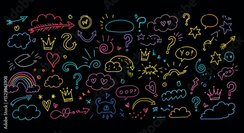 doodle, art, vibrant, background, cloud, arrow, heart, crown, colourful, neon, symbol, black, contrast, swirl, star, circle, question, mark, fun, playful, abstract, design, creative, hand-drawn, icon, vignetting, whimsical, energetic, pattern, random