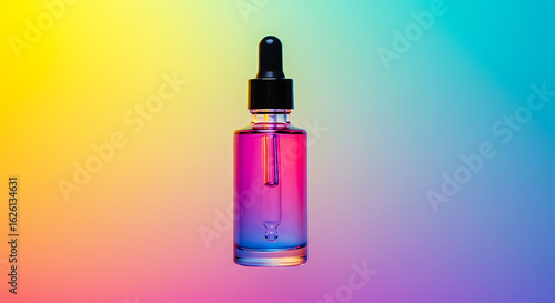 Vibrant dropper bottle with gradient liquid on colorful background