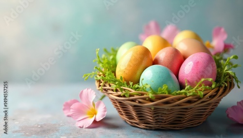 Vibrant dyed Easter eggs in a basket, springtime colors , nature, basket