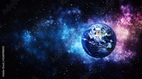 Vibrant Earth glows amid cosmic nebula swirls blue purple hues. AI Generated