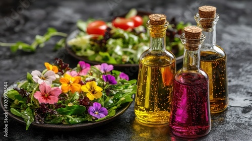 Vibrant Edible Flowers Salad with Colorful Dressing Bottles