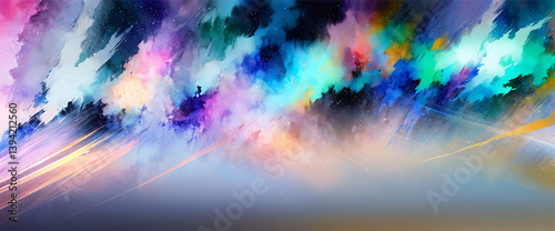 Vibrant explosion of colors sweeps across a misty, textured backdrop, creating a sense of dynamic movement