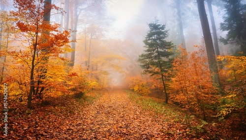vibrant fall foliage misty forest path picturesque nature scenic seasonal beauty gorgeous autumn leaves trees colors scenery trails landscape outdoors