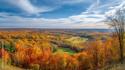 Vibrant fall foliage overlooking a lush valley under a cloudy sky in autumn during the afternoon