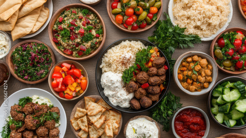 festive, table, widener, dish, food, rice, meatball, salad, herb, colourful, mediterranean, cookery, sharing, celebration, bowl, plate, fresh, ingredient, parsley, tomatoes, cucumber, yogurt, pita, olive, chickpea, favor, texture, appetising, traditional, variety