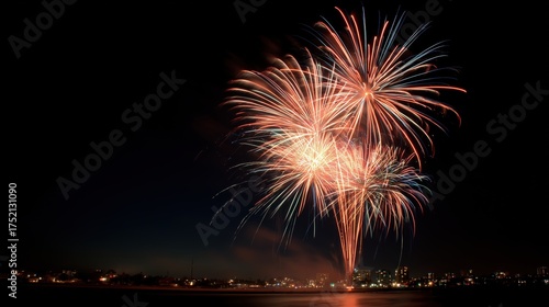 Vibrant fireworks bursting over a waterfront city, reflecting colorful light on the water