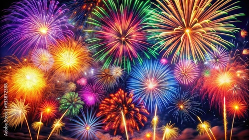 Vibrant fireworks explode in the night sky, casting a kaleidoscope of colors against a dark backdrop, welcoming a fresh start in the new year.