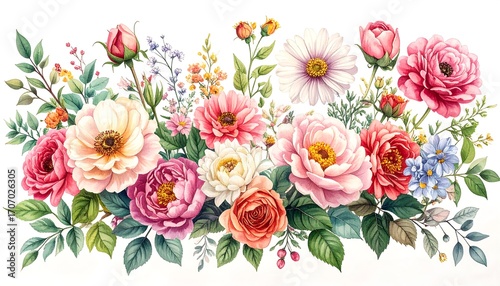 flower, rose, peony, daisy, bud, leaf, stem, pastel, colours, spring, summer, botanical, delicate, arrangement, colourful, lush, vibrant, blooming, nature, pretty, elegant, art, illustration, watercolor, detailed, decorative, floral, bouquet, garden