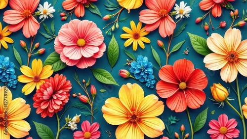 cosmos, daisy, flower, floral, arrangement, colourful, vibrant, teal, background, bloom, blossom, botanical, summer, spring, flower petals, garden, nature, beauty, bright, delicate, flora, design, artwork, illustration