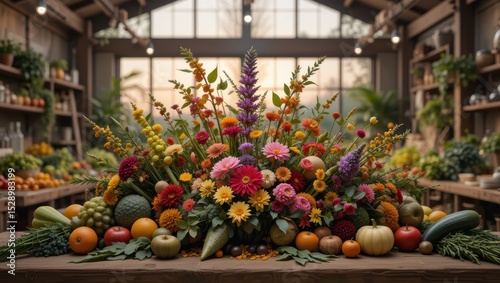 Vibrant Floral Arrangement with Seasonal Flowers and Fresh Produce in a Greenhouse Setting
