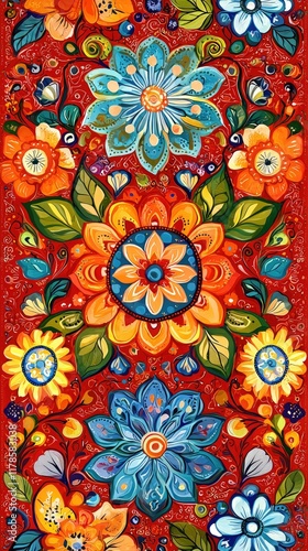 artwork, orange, bright, red, blue, pattern, flower petals, south american, style, flower, folk, traditional, ornate, image, illustration, green, painting, cheerful, celebration, art, summer, intricate, stem, leaf, beauty, joyful, spring, graphic, artistic, abstract, elegant, design, mexican, floral, visual, vibrant, detailed, decorative, blooming, modern, botanical, background, creative, yellow, nature, contemporary, colourful, texture