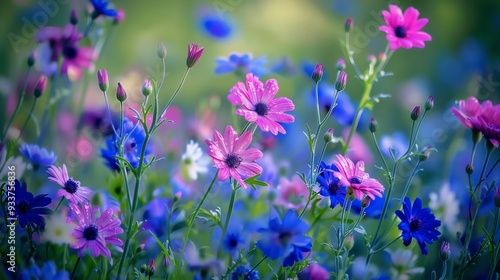 flower, field, pink, blue, green, nature, delicate, vibrant, colours, bloom, garden, meadow, summer, spring, beauty, wildflower, floral, flower petals, blossom, stem, leaf, sunlight, soft, light, natural, fresh, high-coloured, foliage, bright, flora, botany, dainty, elegant, lush, romantic, landscape, background, texture