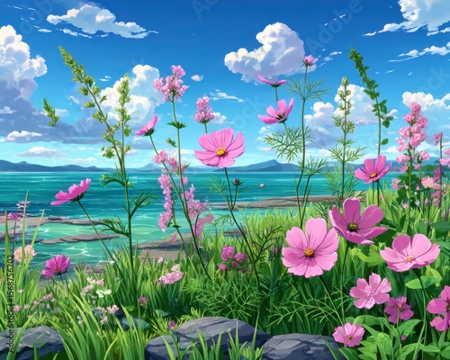 flower, plant, nature, water, sky, cloud, colourful, vibrant, summer, idylli, peaceful, scenic, landscape, blooming, lush, green, pink, rock, shoreline, ocean, fresh, calm, beautiful