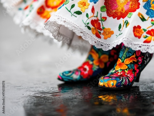 Vibrant floral-embroidered boots stand elegantly on a wet surface, showcasing cultural artistry and colorful design.