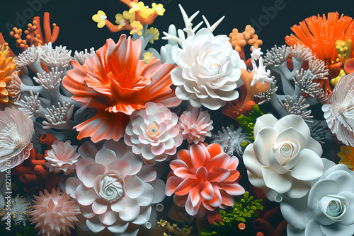 Vibrant flower composition, artistic arrangement, colorful blooms, three-dimensional design, decorative art, copy space