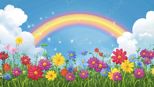 Vibrant Flower Field Under Stormy Clouds and a Colorful Rainbow With a Magical Atmosphere