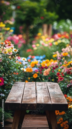 Vibrant flower garden with wooden table in a cozy outdoor setting