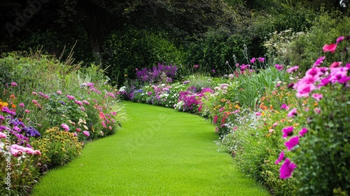 Vibrant Flower Pathway in Lush Garden with Colorful Blooms and Clear Space for Text or Messaging