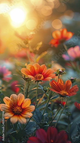 Vibrant flowers, a symbol of the market's endless growth and potential, bloom in a sunlit garden with a soft focus and minimalistic style.