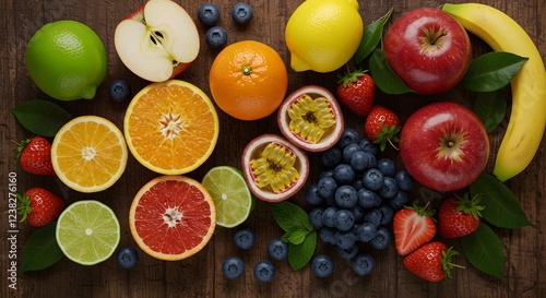 Vibrant Fresh Fruit Assortment on Wooden Background