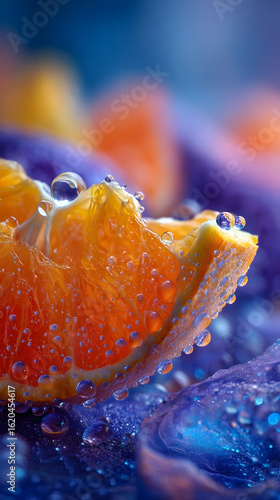 orange, fruit, citrous, slice, fresh, water, drop, liquid, macro, closeup, vibrant, juicy, healthy, refreshing, sparkling, blue, purple, cool, summer, nourishment, vitamin, diet, food, drink, texture, surface, bright, high-coloured, colourful, abstract, bokeh, blurry, background, light, detail, clear, transparent, bubble, droplet, edible, natural, sweet, lemony, ingredient, concept, wellness, delicious