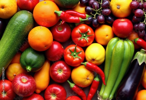 fruit, vegetable, apple, orange, tomatoes, pepper, courgette, grape, aubergine, food, produce, healthy, still life, background
