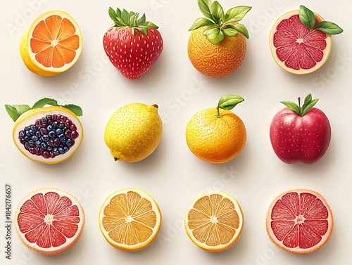 fruit, half, citrous, vibrant, assorted, arrangement, strawberry, orange, grapefruit, lemon, fresh, juicy, healthy, vitamin, botanical, food, still, life, display, ripe, colours, texture, delicious, nourishment, culinary, epicure, harvest, presentation, raw, background, ingredient, table, design, composition, closeup, detail, organic, studio, pattern, summer, artistic