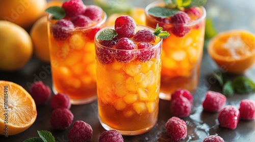 Vibrant fruit jelly desserts in tall glasses garnished with fresh raspberries and mint leaves on a rustic table setting