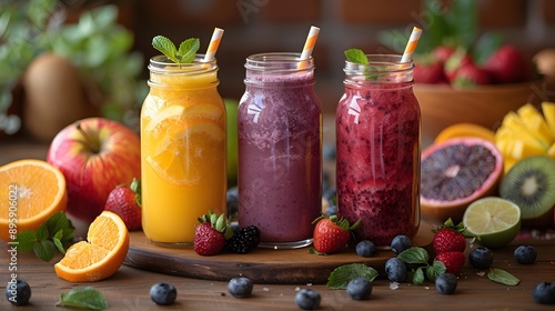 Vibrant fruit smoothies in mason jars with straws, surrounded by fresh fruits like oranges, strawberries, apples, and kiwis; ideal for promoting healthy eating, juice bars, or diet-related content,