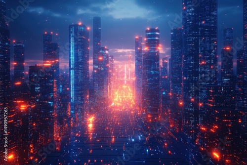 skyline, neon light, skyscraper, urban, dusk, glowing, colorful sky, technology, modern architecture, city landscape, evening, nightlife, illuminated, building, digital, metropolis, scenery, vivid colors, electric, light, landscape, horizon, atmosphere, transportation, advancement, innovation, architecture, street, beauty, night, depth, pattern, serene, dynamic