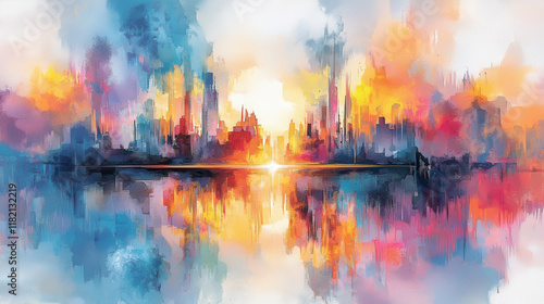 vibrant futuristic cityscape reflecting on water, showcasing sustainable energy. colorful skyline is illuminated by warm sunset