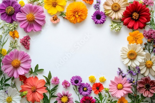 Vibrant garden flowers arranged in a semi-circular border, ideal for greeting cards, invitations, or seasonal promotions for weddings, spring, and Mother's Day.