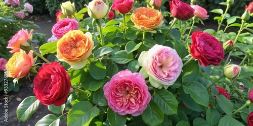 Vibrant garden roses in full bloom display a stunning array of pink and red shades amidst lush green foliage, with ample copy space for text or branding.