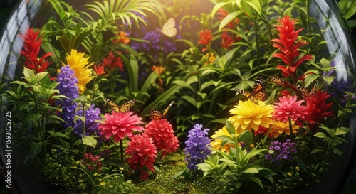 Vibrant garden with colorful flowers and butterflies in sunlit oasis