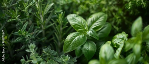 Vibrant garden with lush basil, rosemary, and thyme portrayed in vivid sunlight, highlighting the beauty and vitality of fresh herbs in a celebration of gardening.